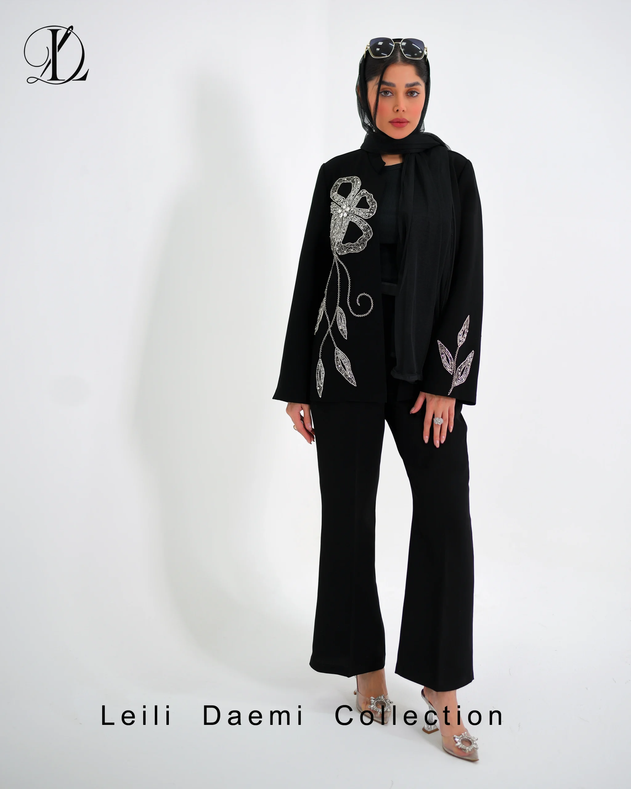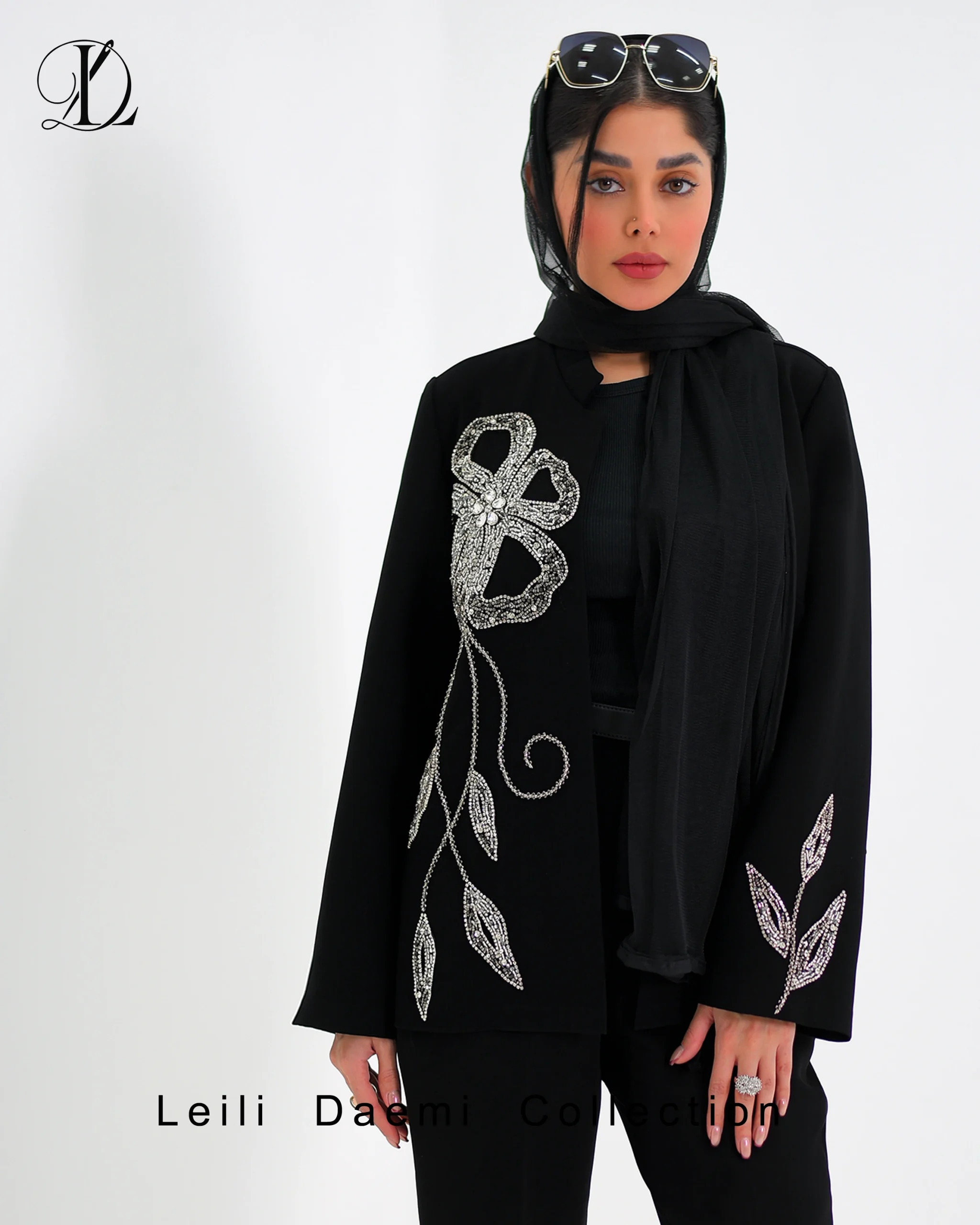 کت کرپ جواهر دوزی طرح گل و برگ , این کت خاص و ظریف از پارچه ی بسیار با کیفیت کرپ کنزو و با دوختی خوش فرم و ایست زیبا دوخته شده است. بخش هایی از کت با جواهر دوزی های درخشان طرح گل و برگ تزئین شده که جلوه ای لوکس ایجاد کرده.