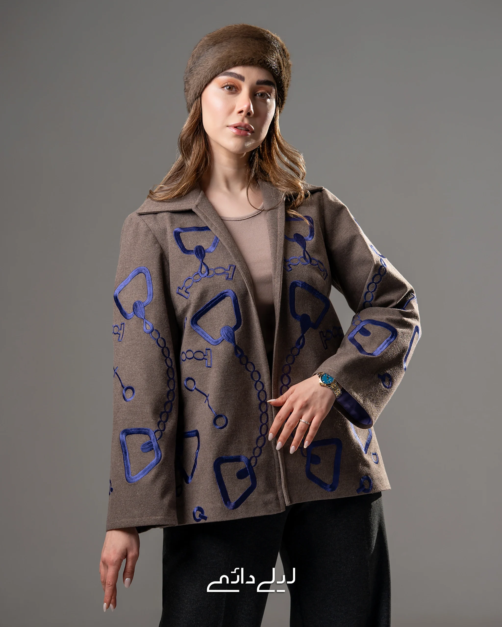 پالتو گلدوزی زنجیری کوتاه خاکی و سورمه ای