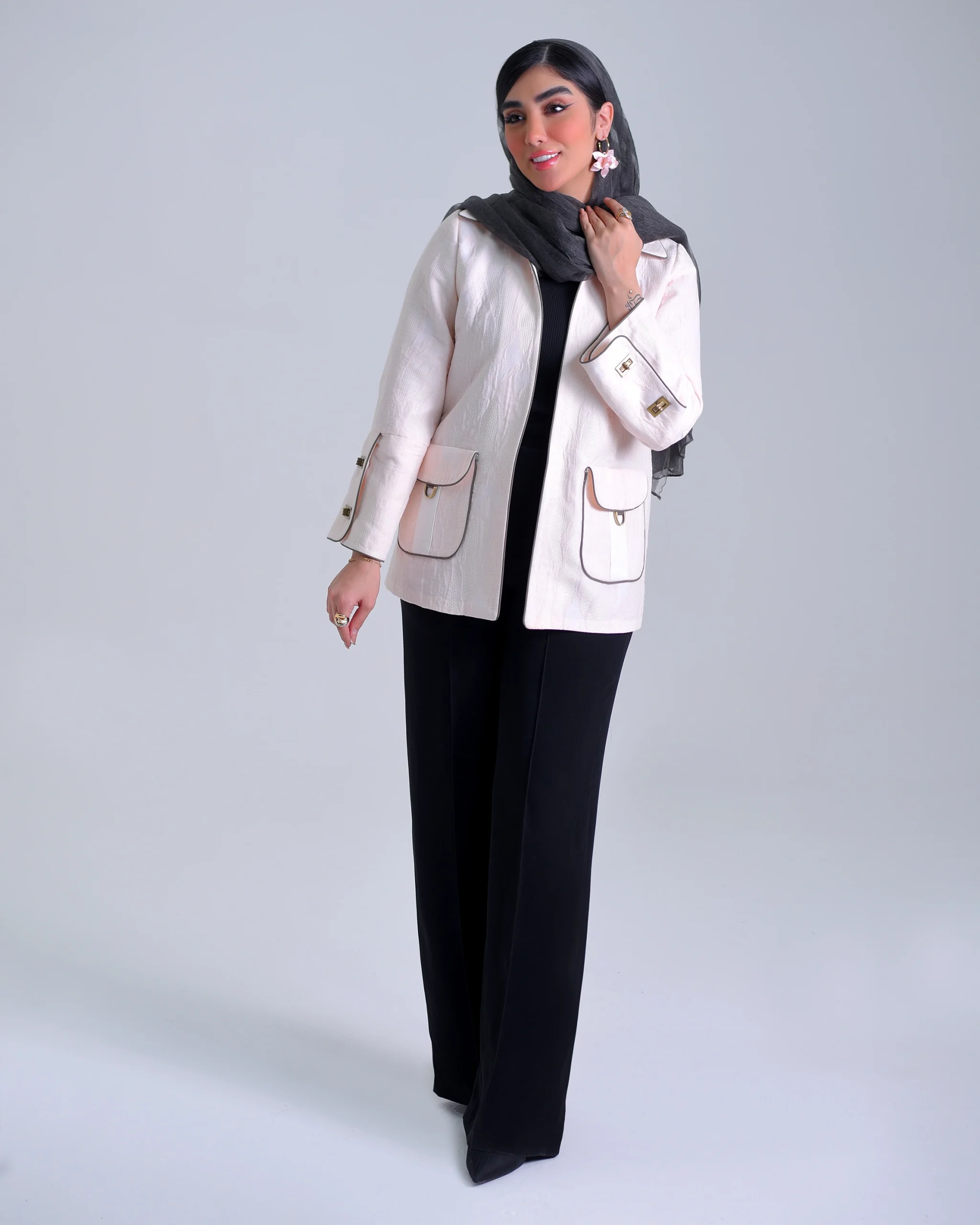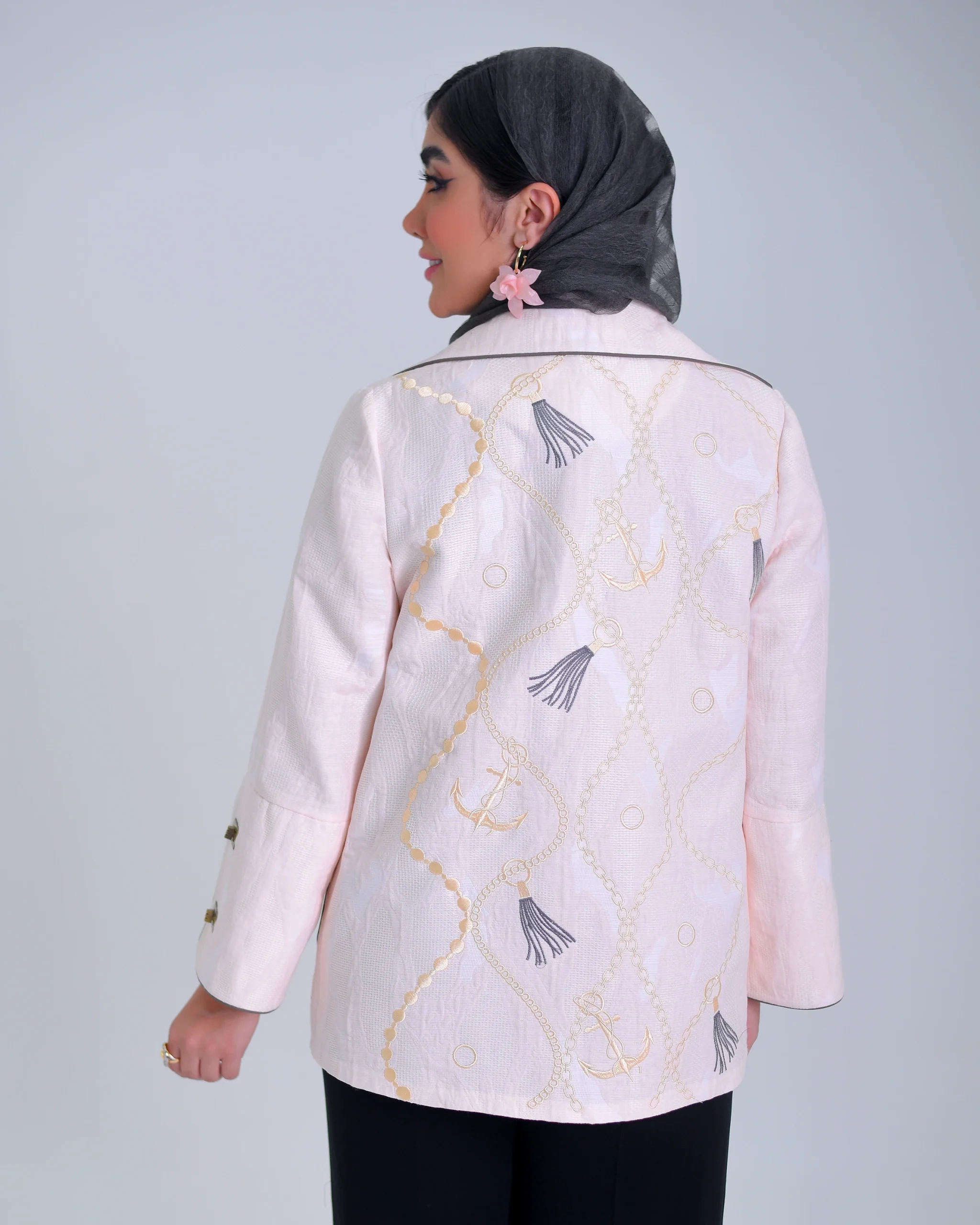 کت ژاکارد موجی صورتی با گلدوزی تسمه , با پارچهی ژاکارد و الگوی موجی، جلوهای لطیف و درخشان به سطح لباس میبخشد و رنگ صورتی ملایم آن حس گرمی و ظرافت را تقویت میکند. جزئیات گلدوزی تسمه در قسمت پشت کار، جلوهای خاص و متفاوت ایجاد کرده و این کت را به گزینهای ممتاز برای استایلهای رسمی و خاص تبدیل کرده است. دوخت تمیز، فرم نیمهکلاسیک و طراحی دقیق سرشانهها باعث شده است این کت هم از نظر زیبایی و هم راحتی در سطح بالایی قرار گیرد.